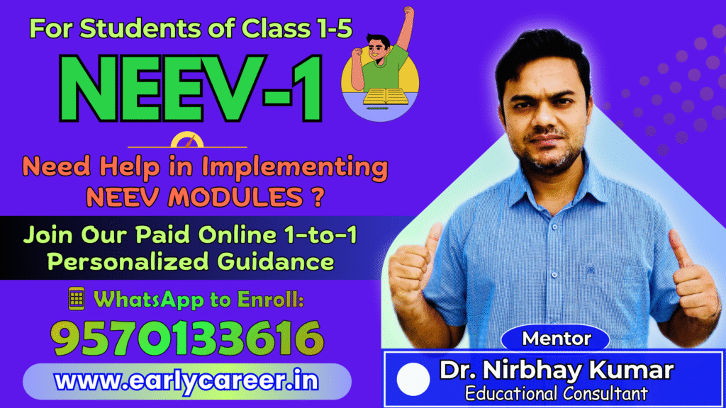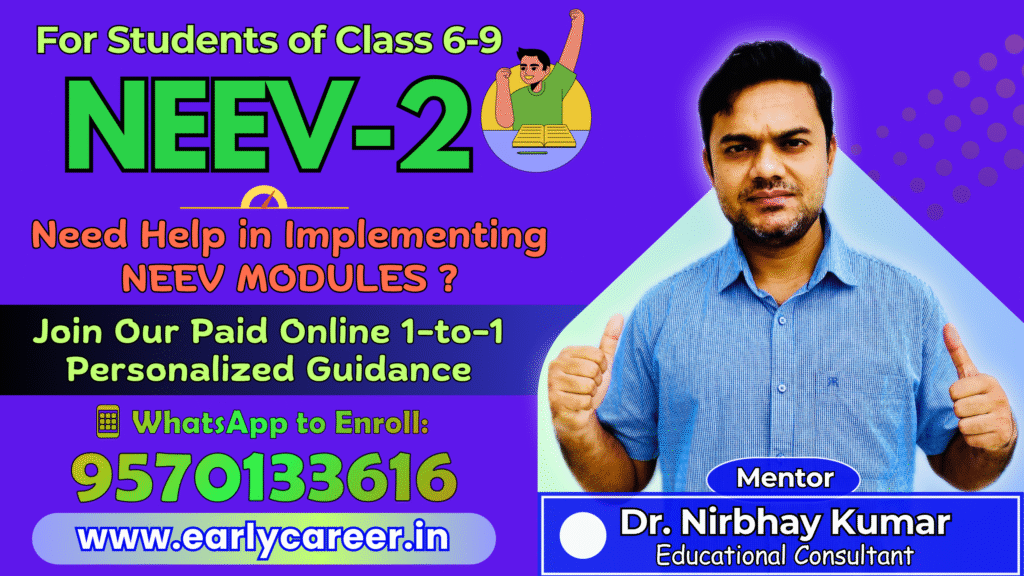 Parents can download all NEEV-1 (for Classes 1–5) and NEEV-2 (for Classes 6–9) modules as free PDFs and also opt for paid personalized one-to-one guidance by Dr. Nirbhy K. for their child’s holistic development.